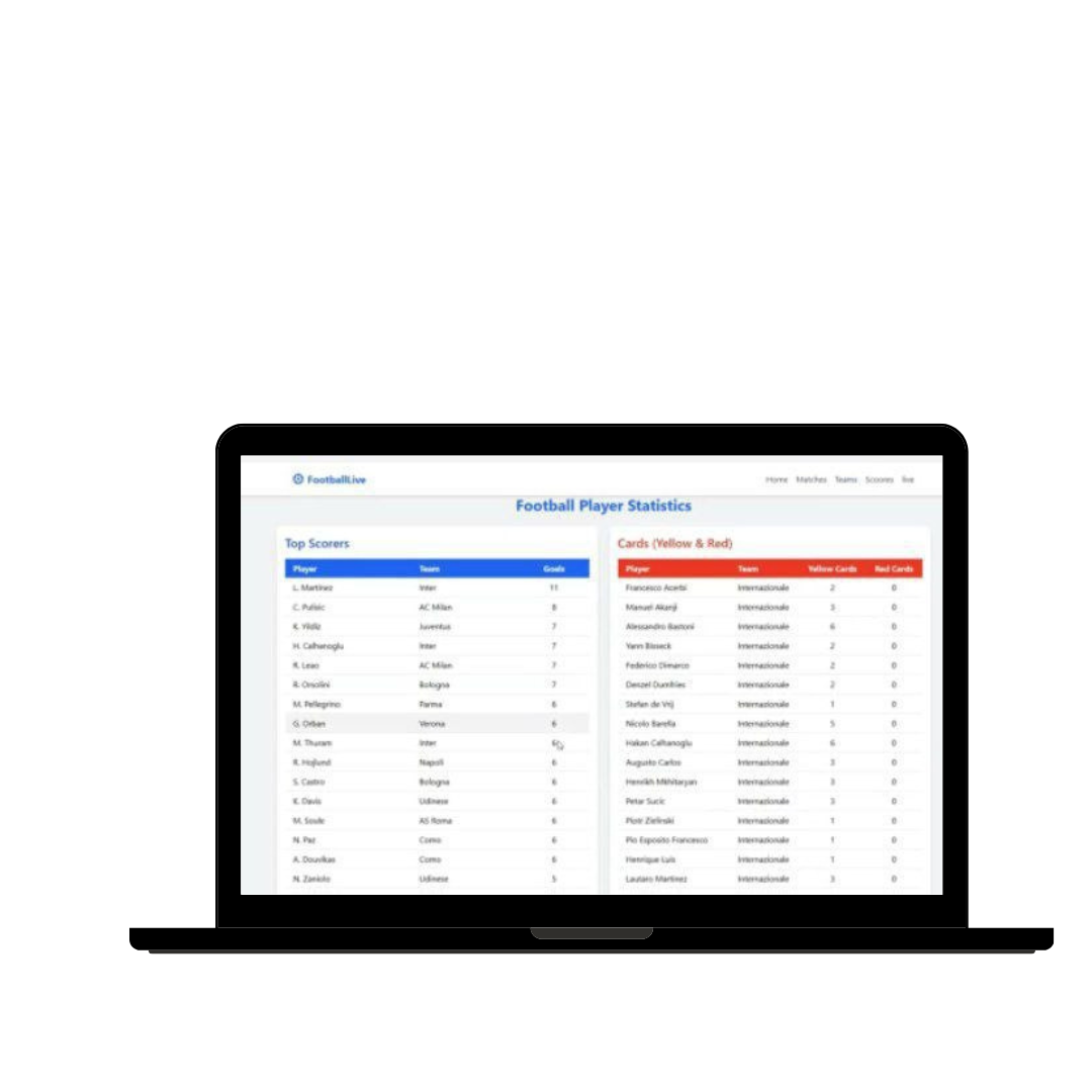 عرض إحصائيات الدوري الإنجليزي (الهدافين وقوائم اللاعبين) من خلال معالجة بيانات JSON معقدة وعرضها في واجهات منظمة.