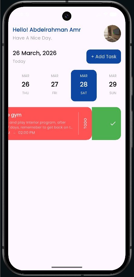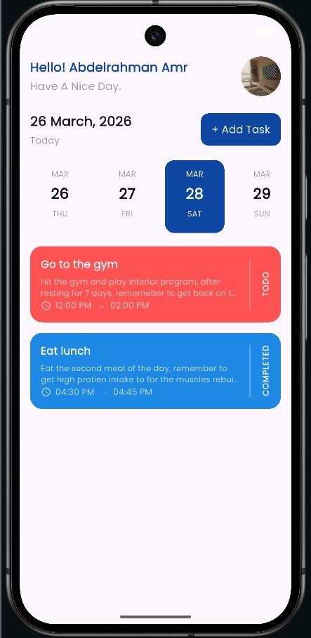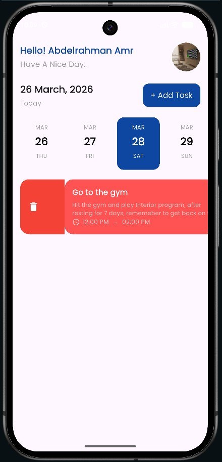 يتيح التطبيق للمستخدمين إنشاء المهام وإدارتها وتتبعها بناءً على تواريخ محددة، مع واجهة نظيفة ومنظمة تم تنفيذها بدقة عالية وفق تصميم Figma لضمان تناسق بصري وجودة عالية في تجربة المستخدم.