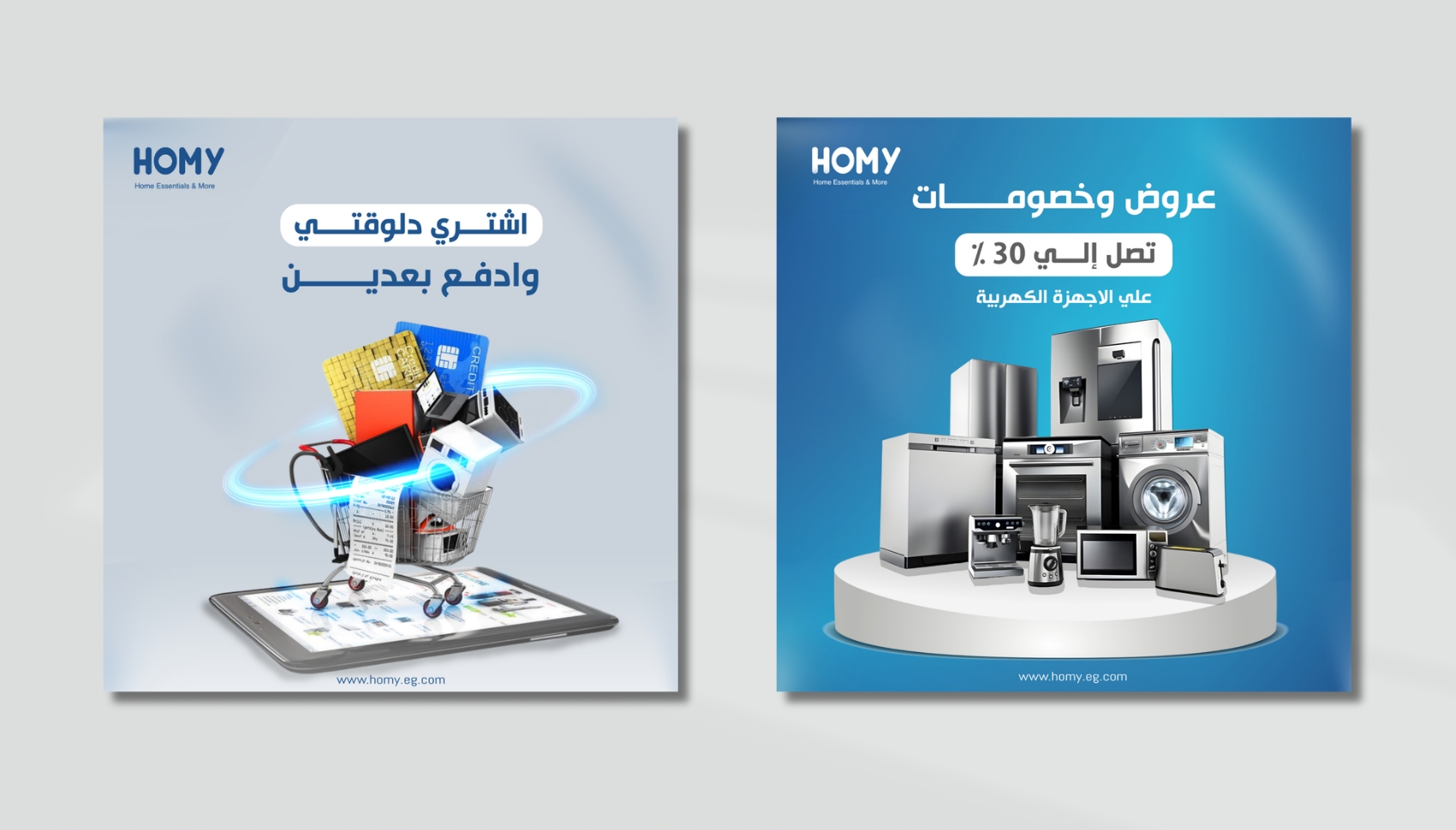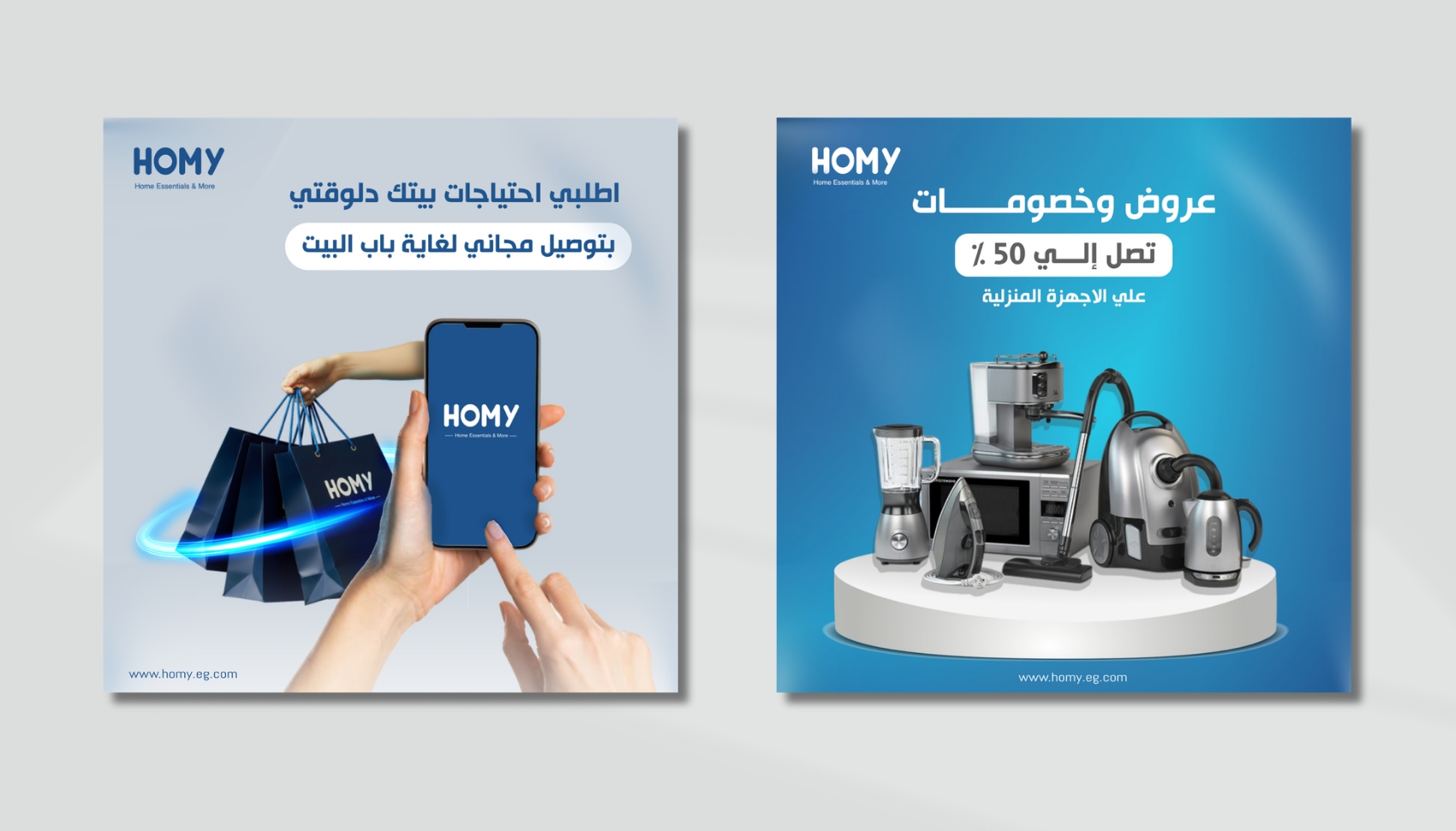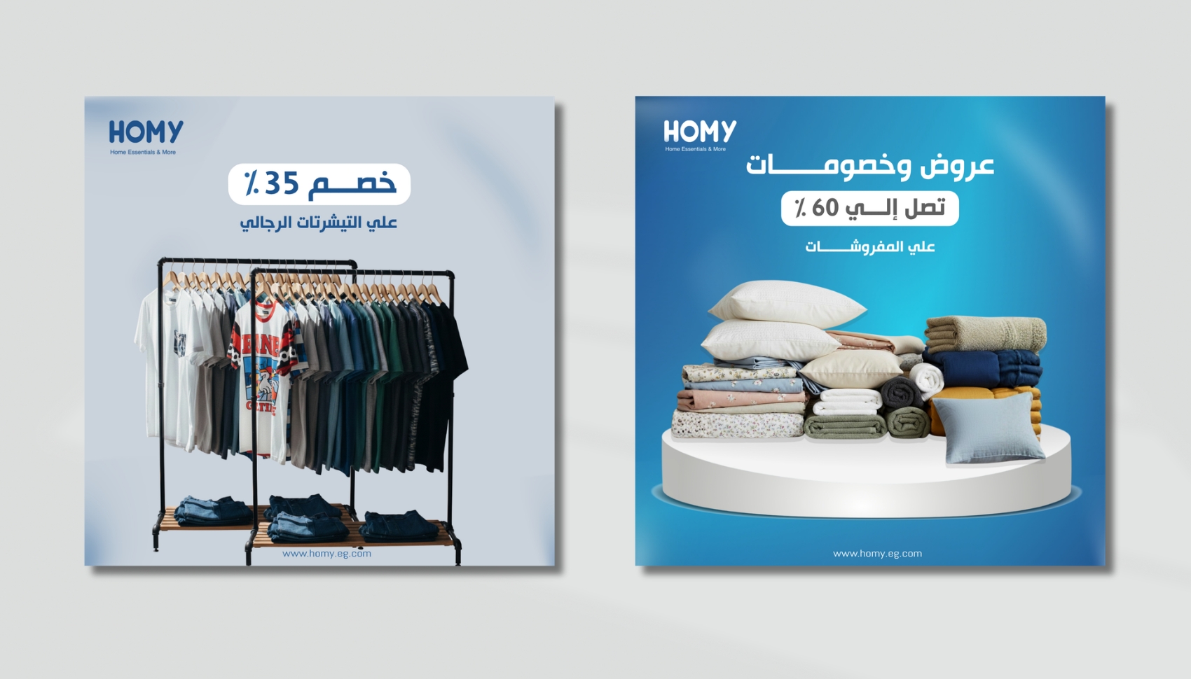 تصميم مجموعة بوستات إعلانية احترافية لمتجر HOMY للتجارة الإلكترونية