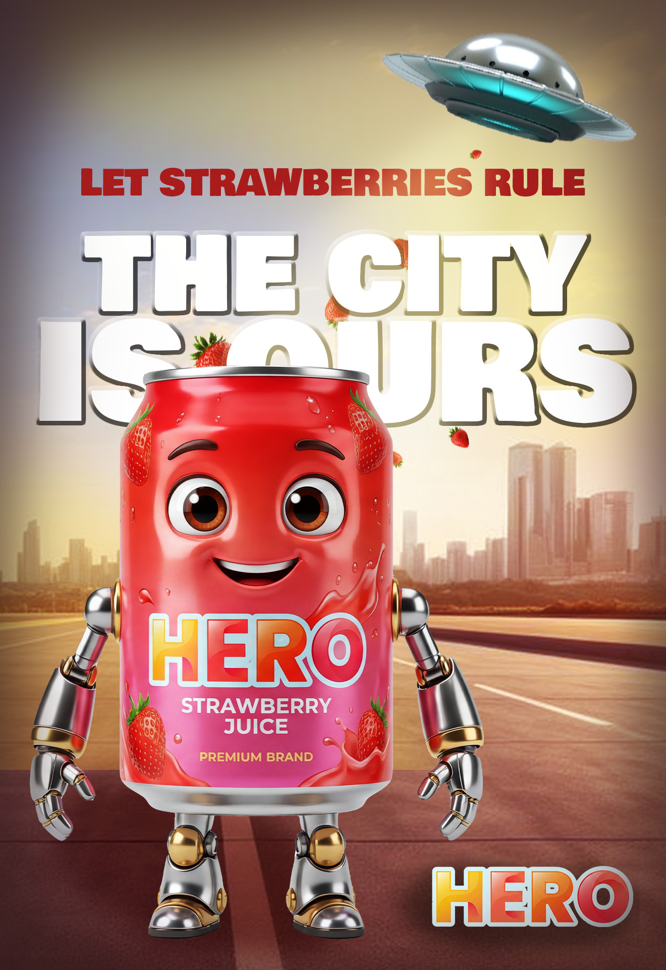 Creative 3D billboard design for a fruit juice brand featuring animated can characters, bold typography, and vibrant colors. Designed for high-impact outdoor advertising with a fun “city invasion” concept.