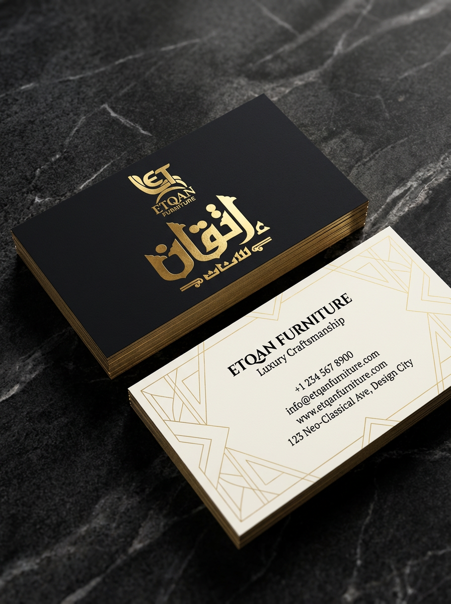 لوحة الألوان: تم اختيار مزيج الأسود الفحمي مع الذهبي المطفي (ذهبي مط) والبيج الكريمي، لإعطاء إحساس بالثراء والاستقرار الذي تتطلبه صناعة الأثاث الفاخر.
