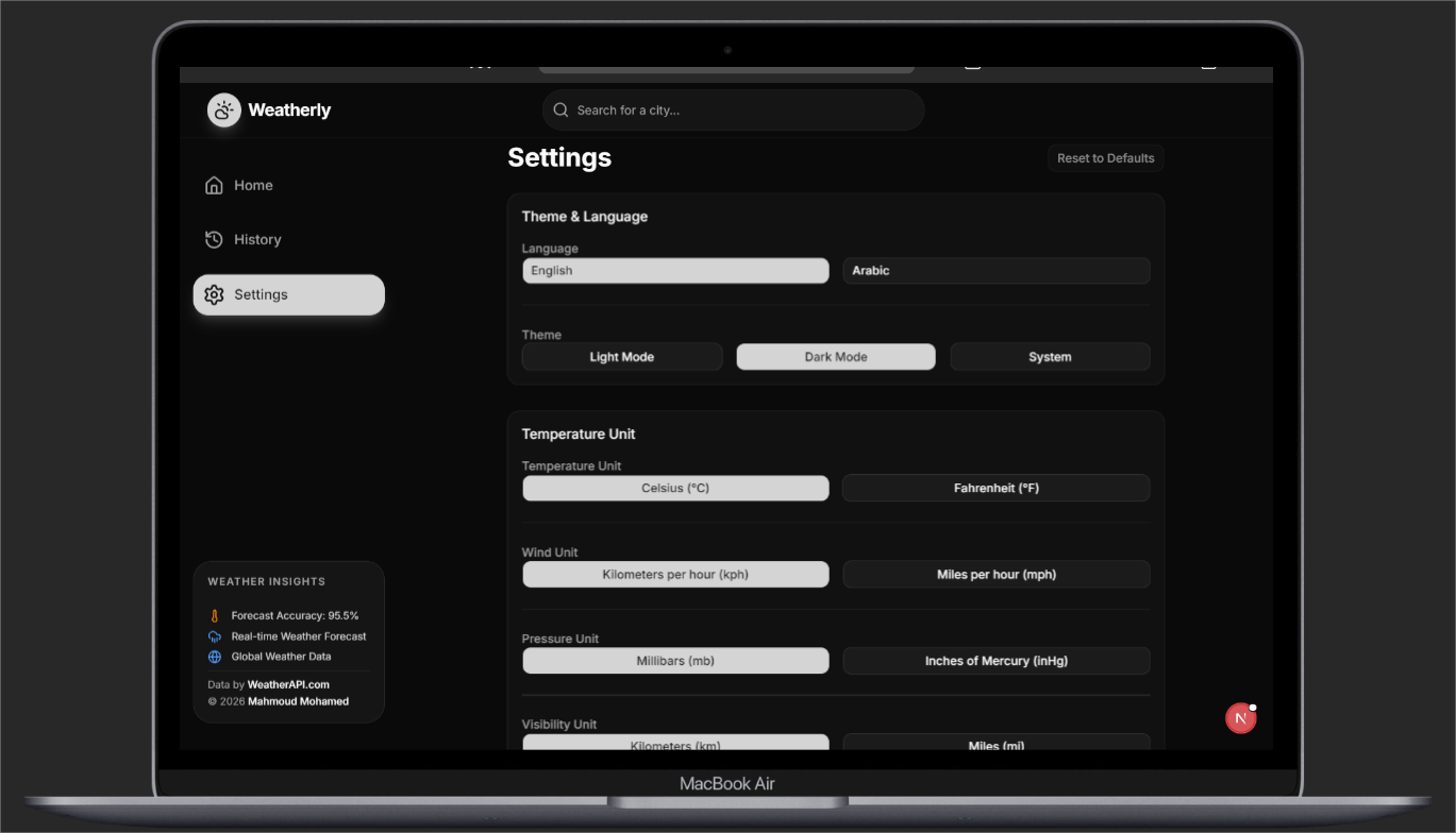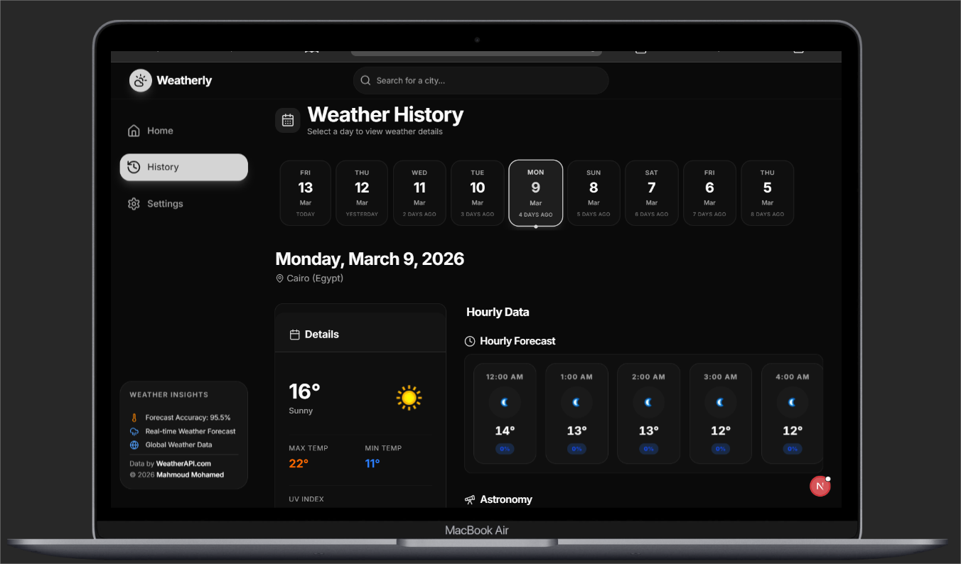 قمت بتطوير تطبيق ويب حديث ومتكامل لعرض معلومات الطقس بشكل تفاعلي وسريع، بهدف تزويد المستخدمين بإمكانية البحث عن أي مدينة حول العالم والحصول على بيانات الطقس الحالية وتوقعاتها المستقبلية بطريقة واضحة وسهلة الاستخدام. صممت التطبيق ليكون لوحة تحكم تفاعلية توفر تجربة مستخدم سلسة وغنية بالمعلومات.