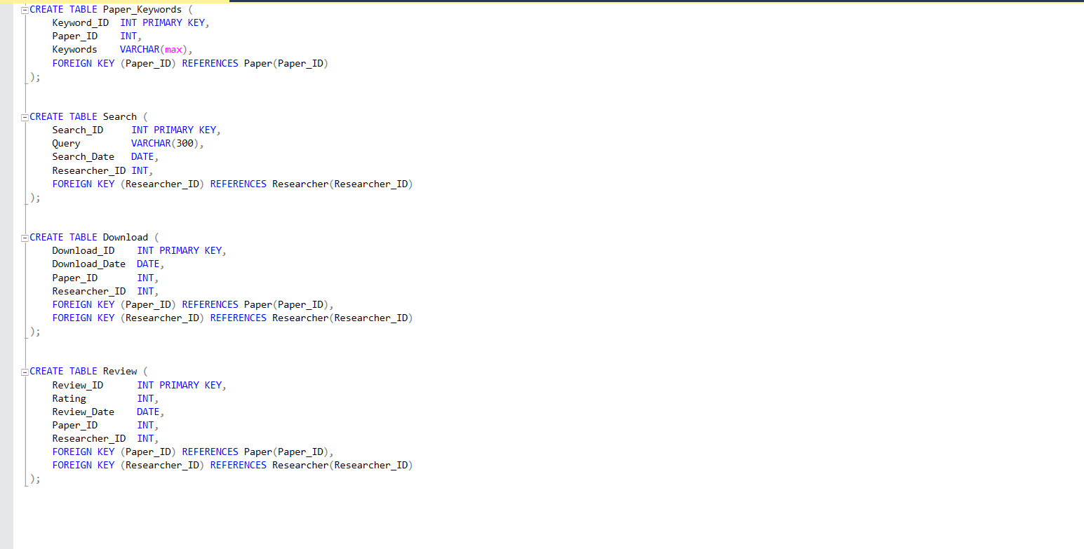 - إنشاء فهارس (Indexes) فعالة على الحقول الرئيسية لتسريع عمليات البحث والاستعلام داخل قاعدة البيانات، مما يمكن المستخدمين من الوصول إلى الأوراق أو مجموعات الأوراق البحثية بسرعة وكفاءة عالية.