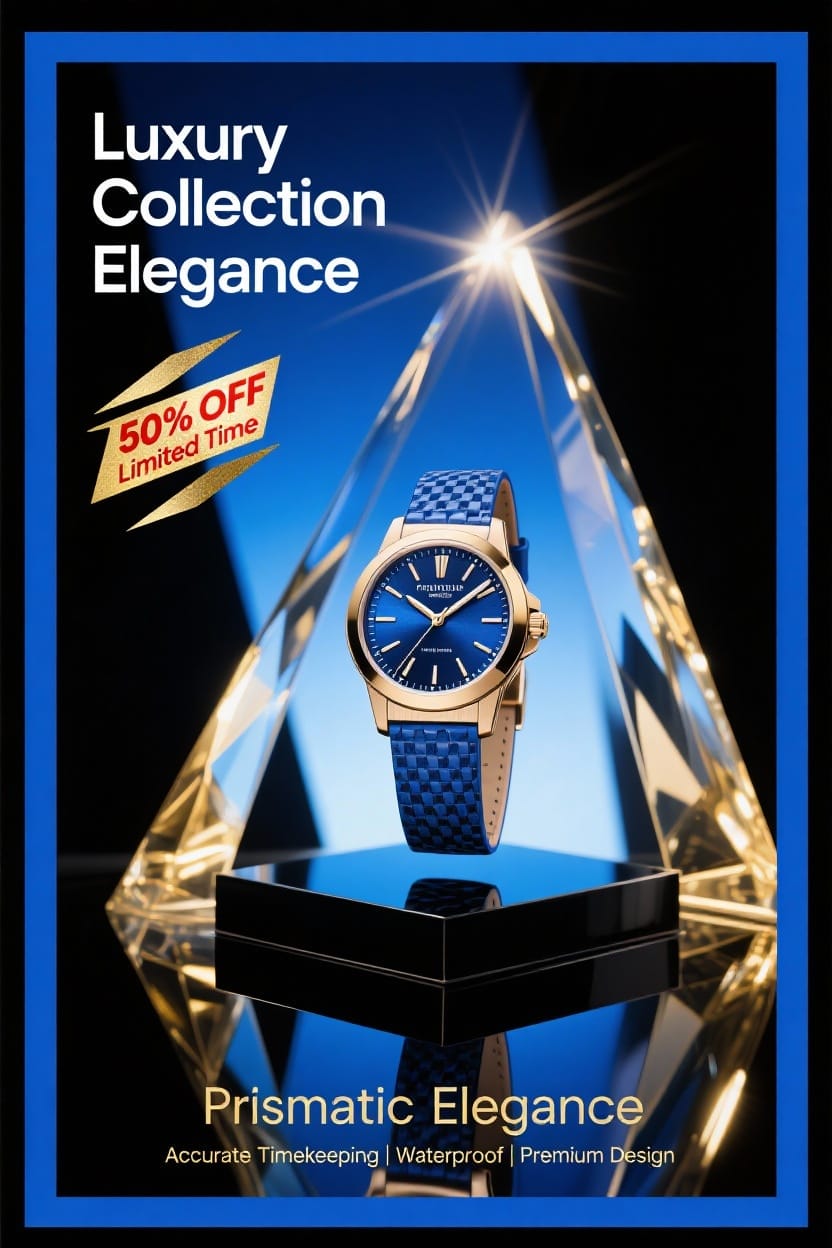 قمت بتصميم إعلان احترافي لمنصات التواصل الاجتماعي، مخصص لمجموعة ساعات "Prismatic Elegance" الفاخرة. كان الهدف الأساسي من هذا العمل هو إبراز الفخامة المطلقة والجاذبية البصرية الفريدة للمنتج، وتعزيز مكانته كخيار راقٍ وموثوق به لدى الجمهور المستهدف.