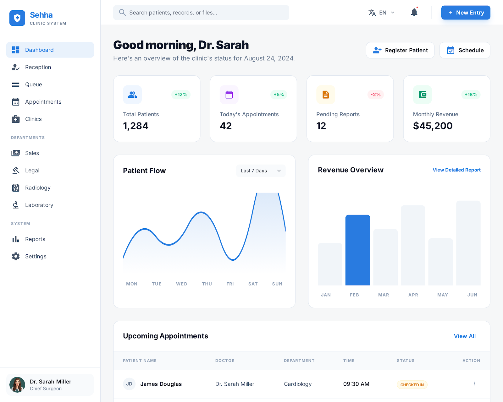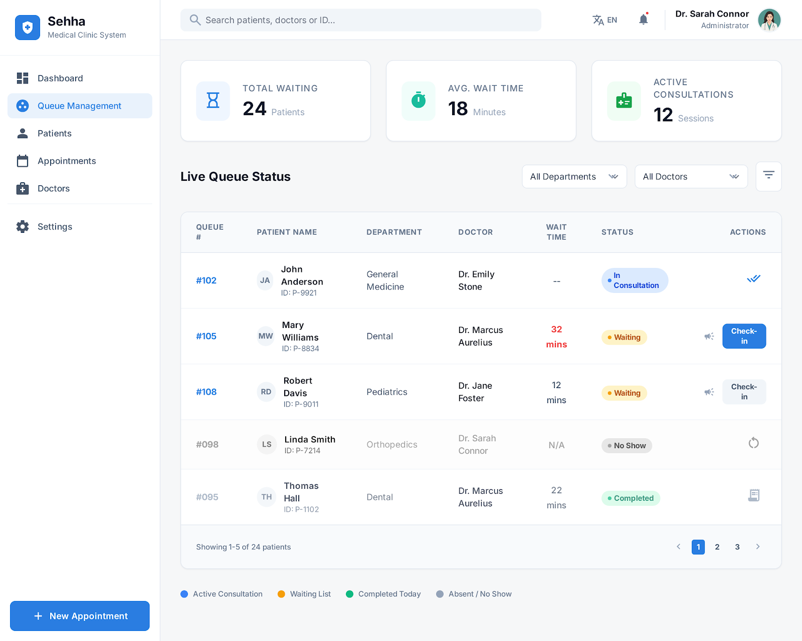 إدارة الحجوزات وقوائم الانتظار: تنظيم مواعيد الزيارات، وتتبع حالة المريض في العيادة لحظة بلحظة (في الانتظار، قيد الكشف، مكتمل).
