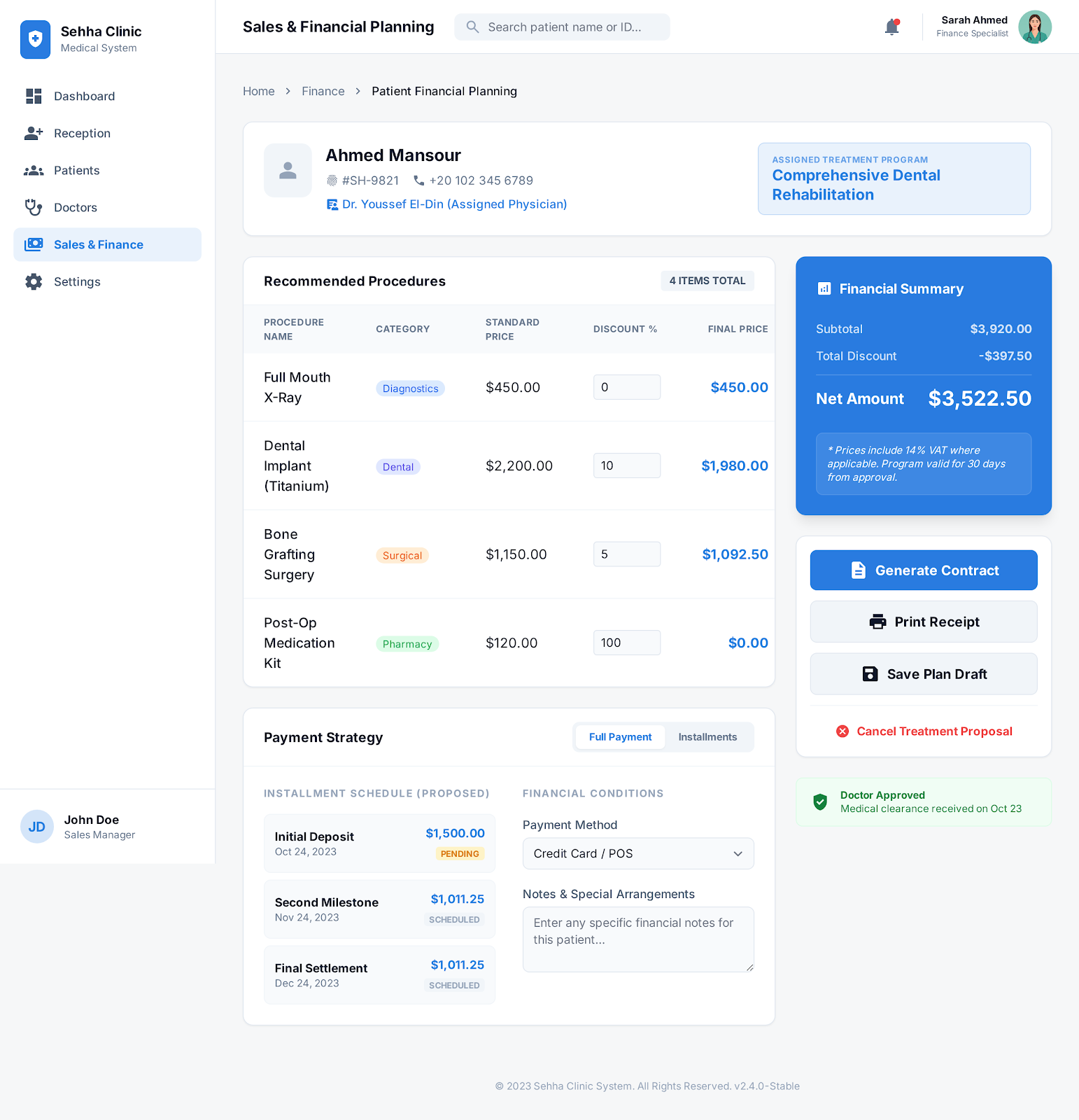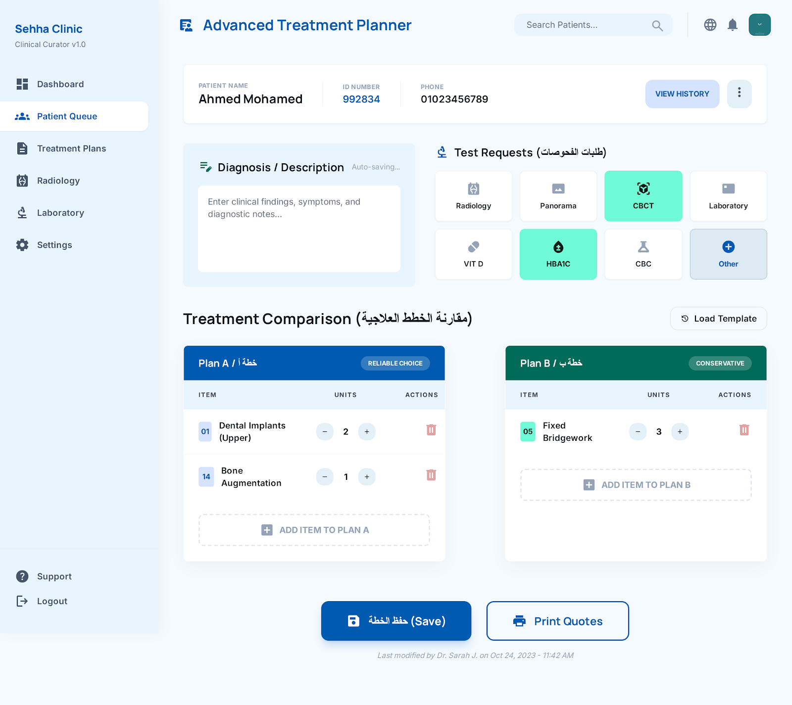 الخطط العلاجية المتكاملة: إنشاء خطة علاجية مخصصة لكل مريض، تشمل الإجراءات الطبية وتكلفتها وجدولتها على عدة جلسات.