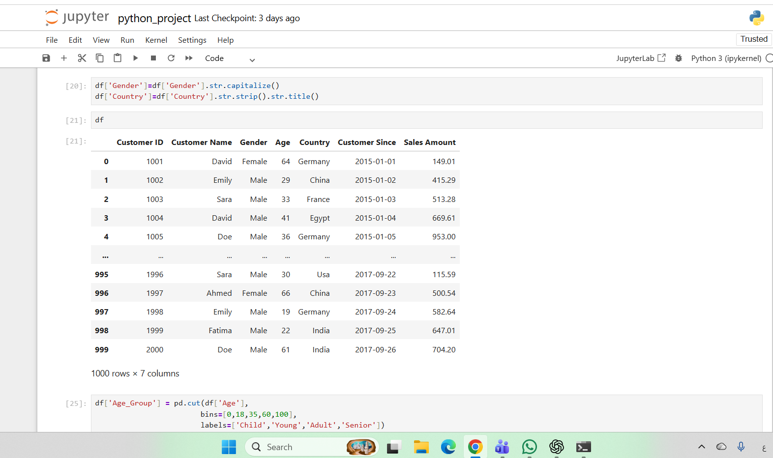 قمت بتنفيذ مشروع تنظيف ومعالجة بيانات باستخدام Python (Pandas) على مجموعة بيانات تحتوي على معلومات العملاء. تضمن العم...